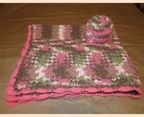 This is a simple pink camouflage blanket with matching hat. Beautiful colors. For blanket and hat $35. I can add appliqués for $5-10.