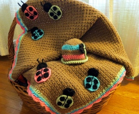 These sweet bugs just pop out of the neutral background. A customer asked for a blanket with lady bugs and this is what I came up with. I was very please with the results. I can make the blanket and matching hat for $40. I can change colors if you would like.