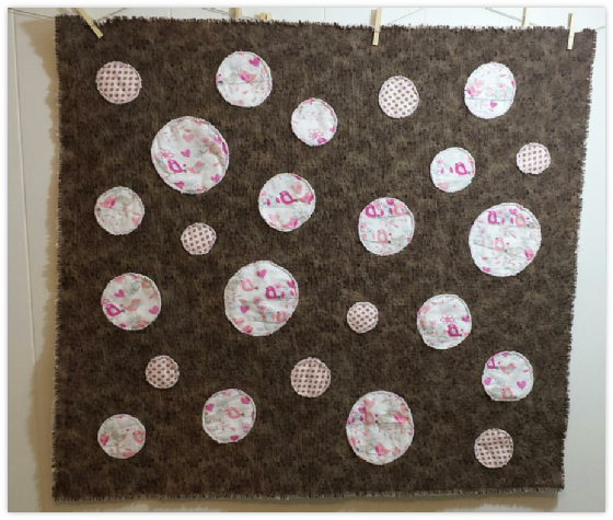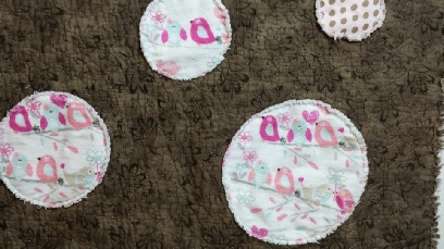 This Baby blanket is soft flannel polka dots on the back, just like the front circle patches. It has detail stitching and rag quilt edges. I love the birdie fabric on the patches.