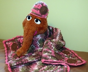 As I was working on this camouflage blanket all I could think of was elephants. So, I found this elephant applique on pinterest (http://two-little-cs.blogspot.ca/2013/04/elephant-square-free-pattern.html ) and I think it worked out great. Thank you Chassity.
