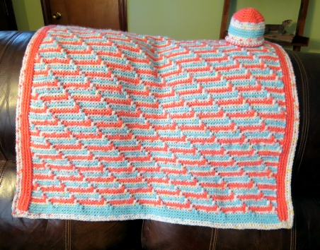 This blanket is so soft and snuggly. This is a very soft blanket made with Charisma Baby yarn. The colors are coral, aqua, and cotton candy. If you want these colors I will have to check for availability. I can make other colors. Measurements are approx 31x35. Cost is $45 for blanket and hat. Would make a great gift for a newborn. Shipping is $10